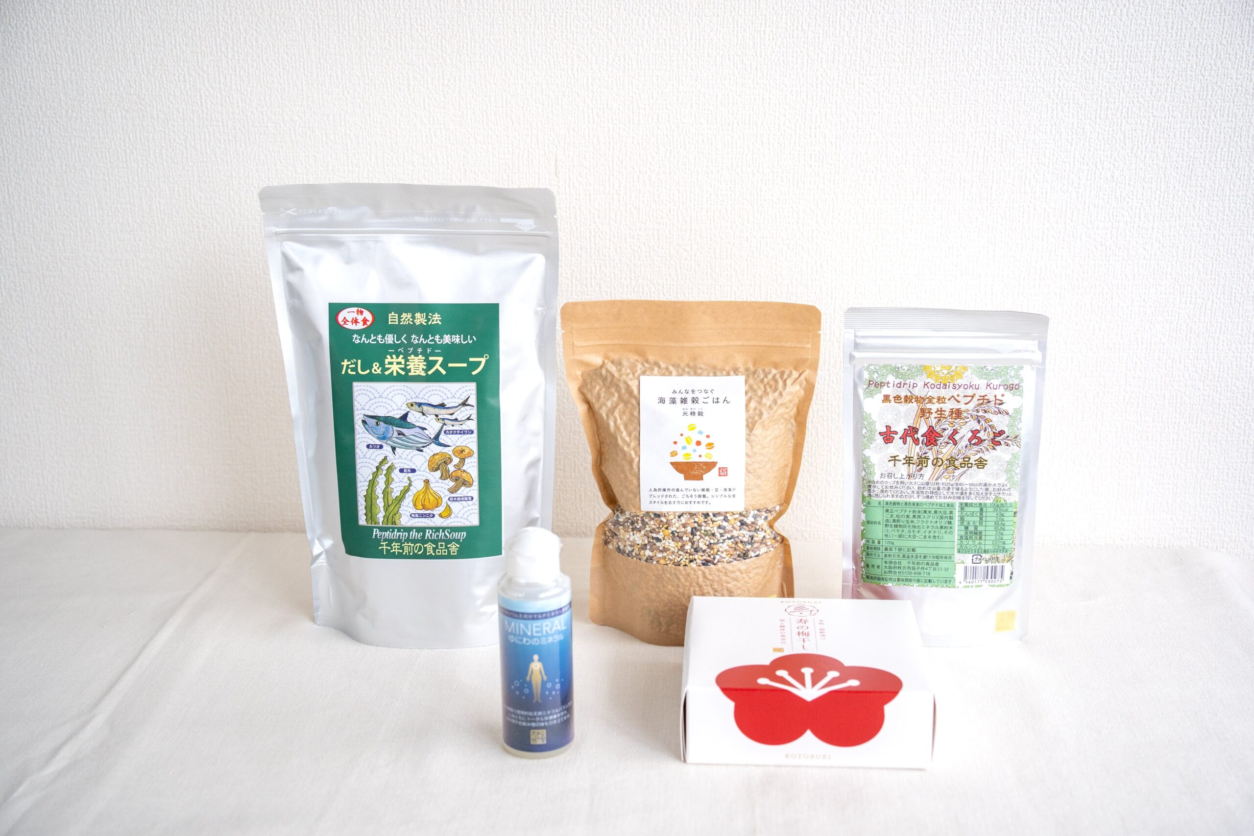 だし栄養スープ、元精穀(かんせいこく)、古代食くろご、ゆにわのミネラル、寿の梅干し