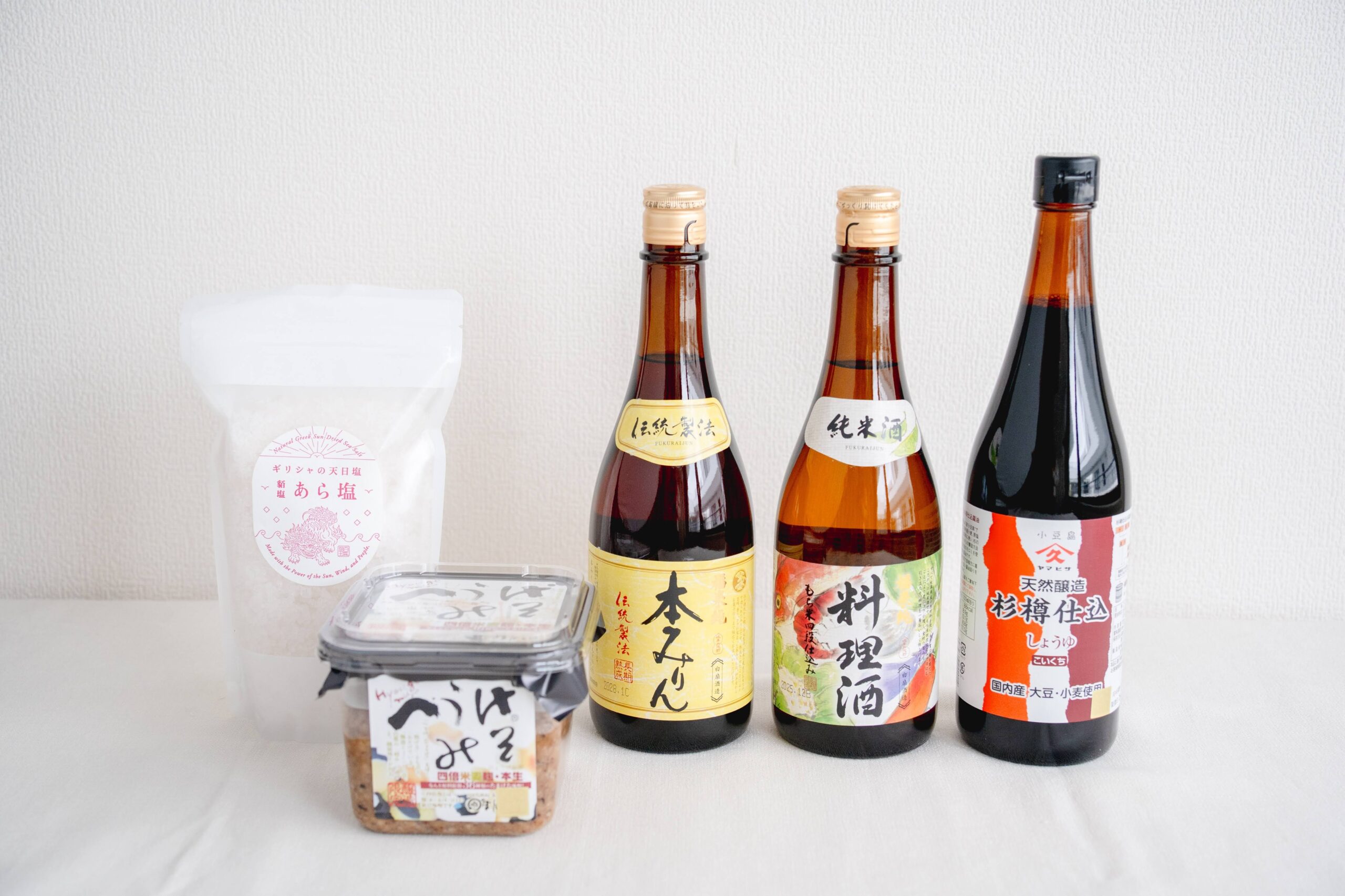 貊塩(みゃくえん)あら塩、へうげみそ、福来純熟成本みりん、福来純熟成料理酒、杉樽仕込純正こい口醤油