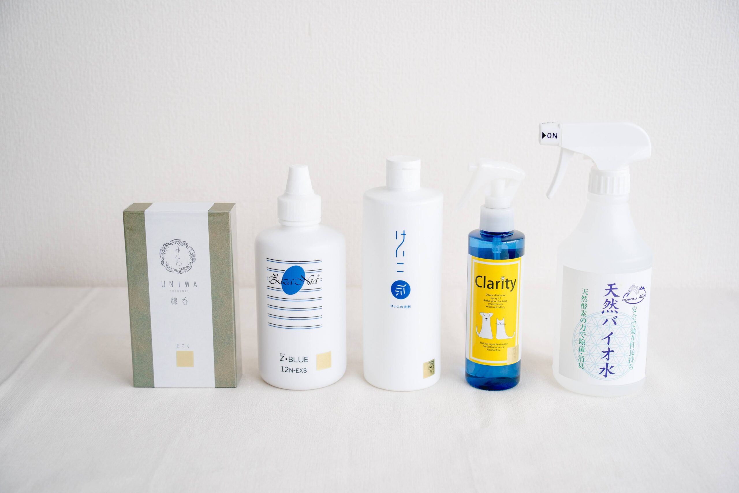 ゆにわの線香まこも、ジザニアゼットブルー、けいこの洗剤、クラリティ、天然バイオ水