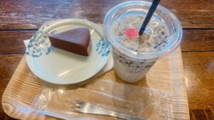 ▲シロフクコーヒーのコーヒーゼリーラテと、カカオケーキ♪最高の組み合わせです。