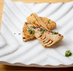 筍のソテーは、米ぬかで炊いた後、利尻昆布と鰹(かつお)でさらに炊き、最後に炭火で焼き目をつけています。