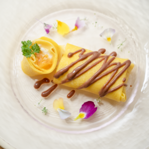 豆乳、少量の白味噌を入れたクレープ生地に、豆乳寒天ホイップ、豆乳カスタード。