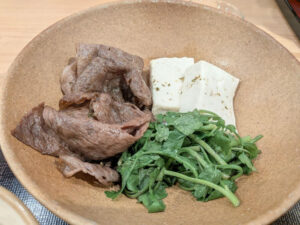 大和榛原牛の太ももの付け根のお肉を、芹(せり)、お豆腐とともにいただく焼しゃぶです。