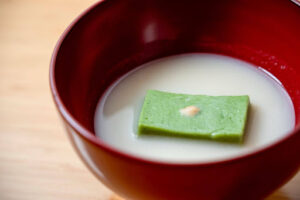 お椀の蓋を開けると、よもぎの鮮やかな緑色と、白味噌の美しい白色がパッと目に飛び込んできました。