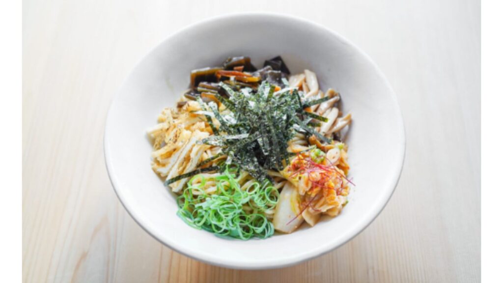 全粒粉の太麺に自家製のコチジャン、3種類の味噌、自然栽培で作られた唐辛子を使ったタレを使用した和えそば。トッピングは、しめじ、昆布の佃煮、炙ったあげ、ネギ、自家製麹で作ったキムチ。ボリュームも満点。