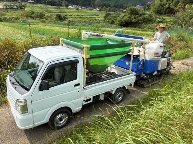 コンバインのタンクがいっぱいになったところで、籾(もみ)を排出。