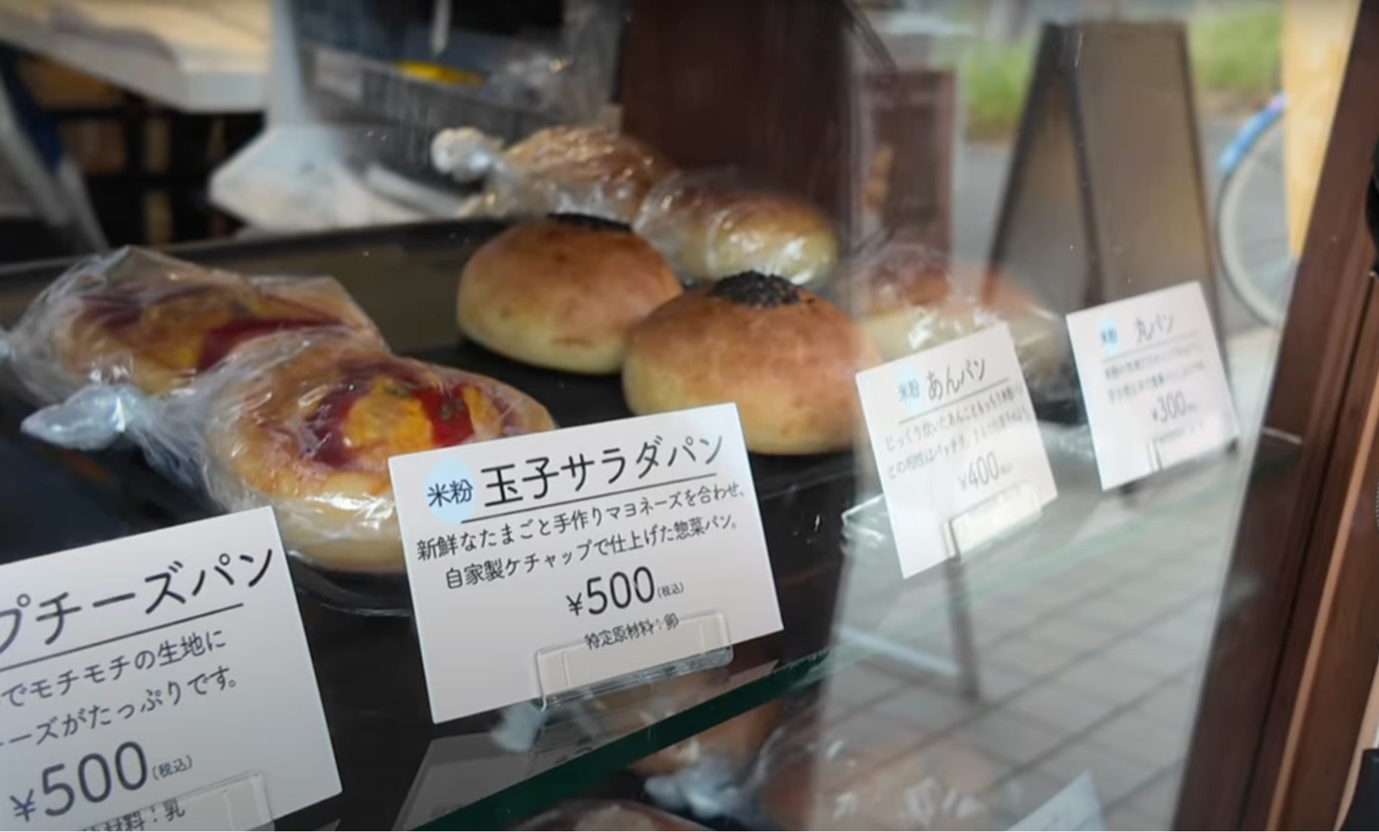 ショーウィンドウには、定番のあんパンや惣菜パンがずらりと並びます。