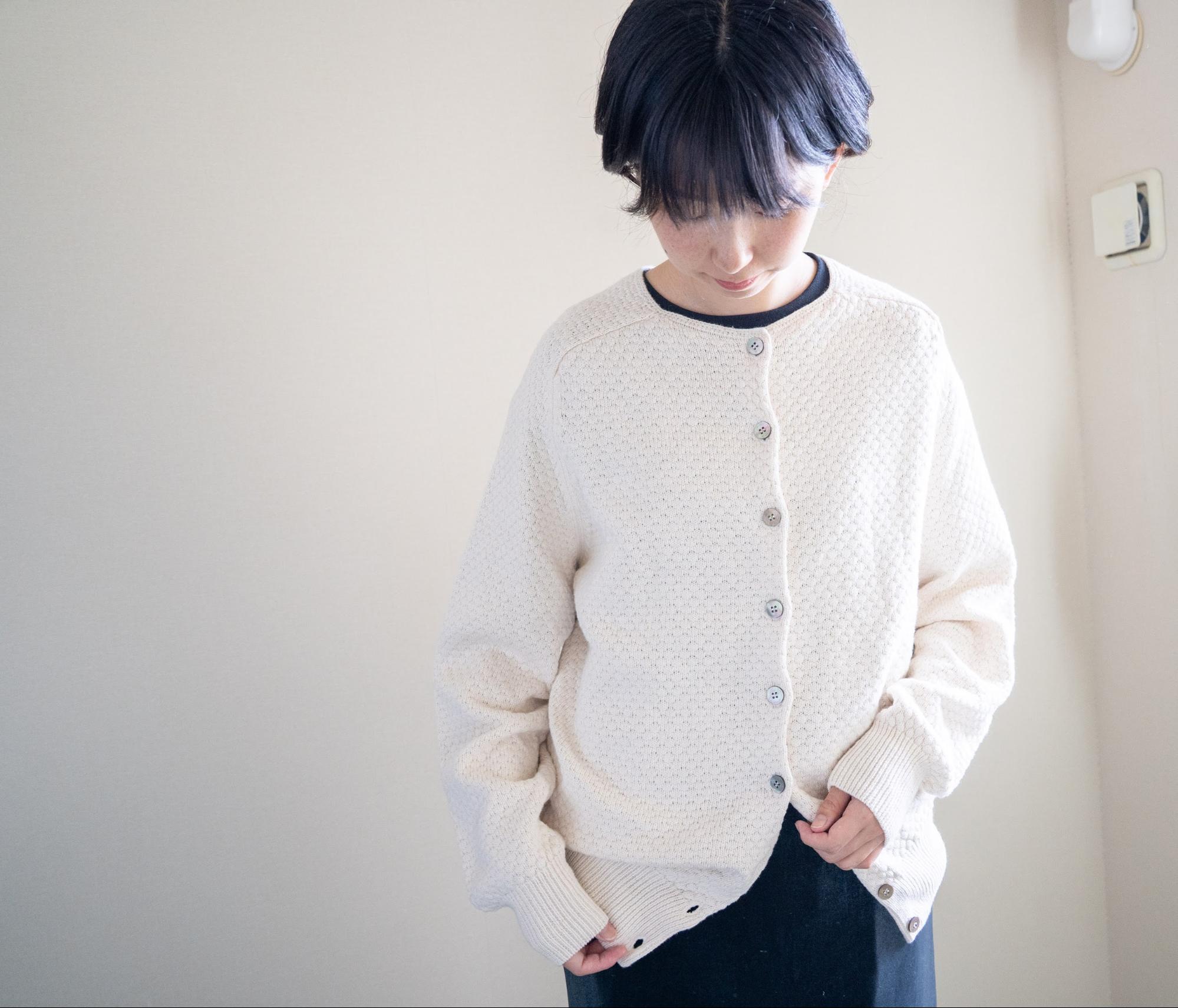 ゆにわマートでも毎年人気の、かのこ編みセーターの生地が、カーディガンに。