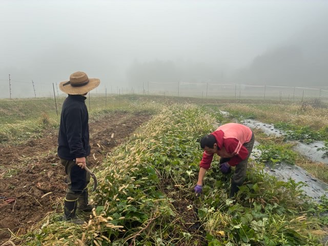 朝もやの中、少し肌寒かったですが、清々しい空気のなかサツマイモ掘りがスタート!