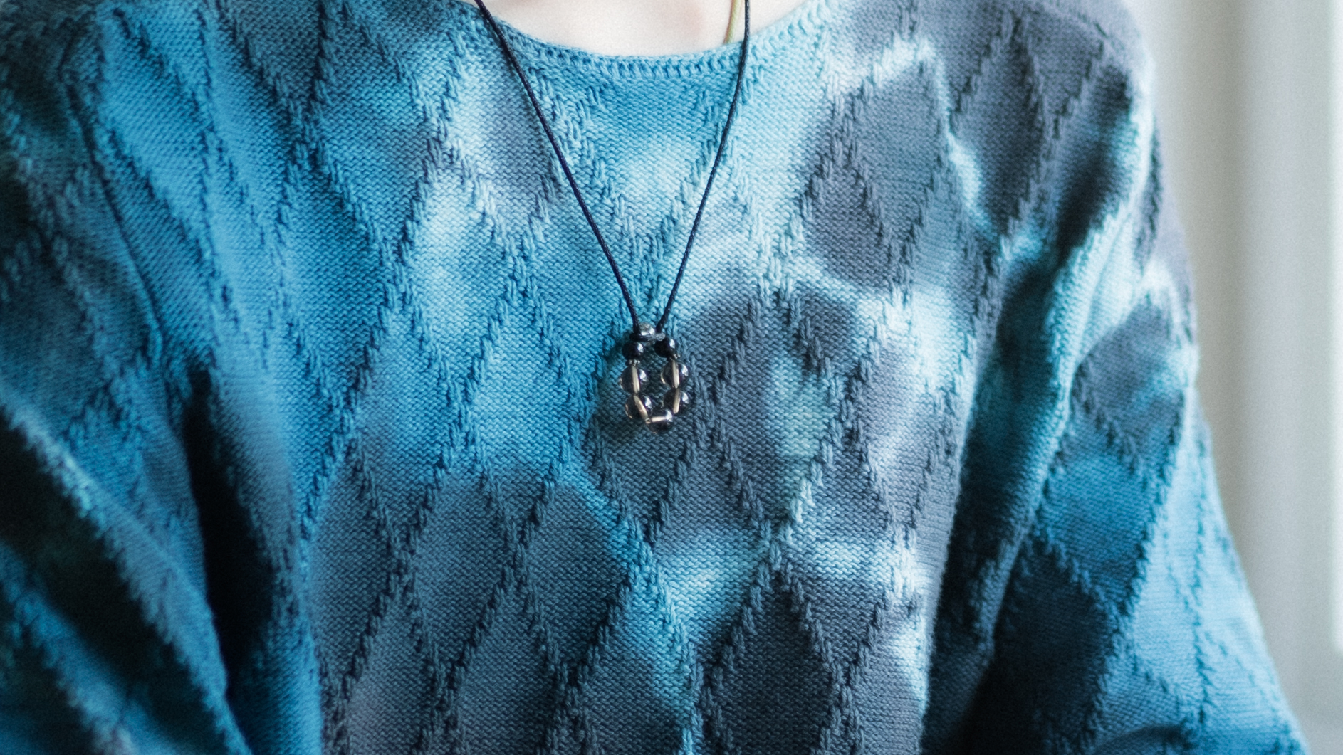 いまわたしが着ているこの服は、新しく発売された「籠(かご)染め」のセーターです。