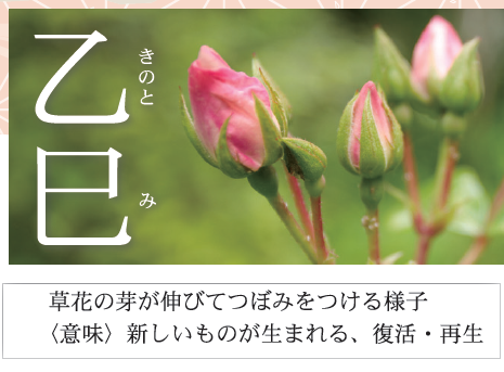 「乙(きのと)」は「芽が抵抗にあい、曲がりくねる様子」を意味します。