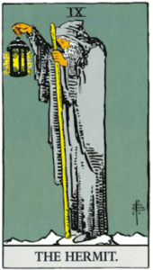〝隠者〟のカードは、暗闇の中で老人が精神世界の旅路に出ている様子を表します。