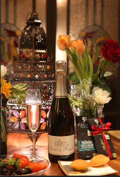 スパークリングワインをグラスに注いで、薔薇恋人の香りがふわりと漂う空間で一口。