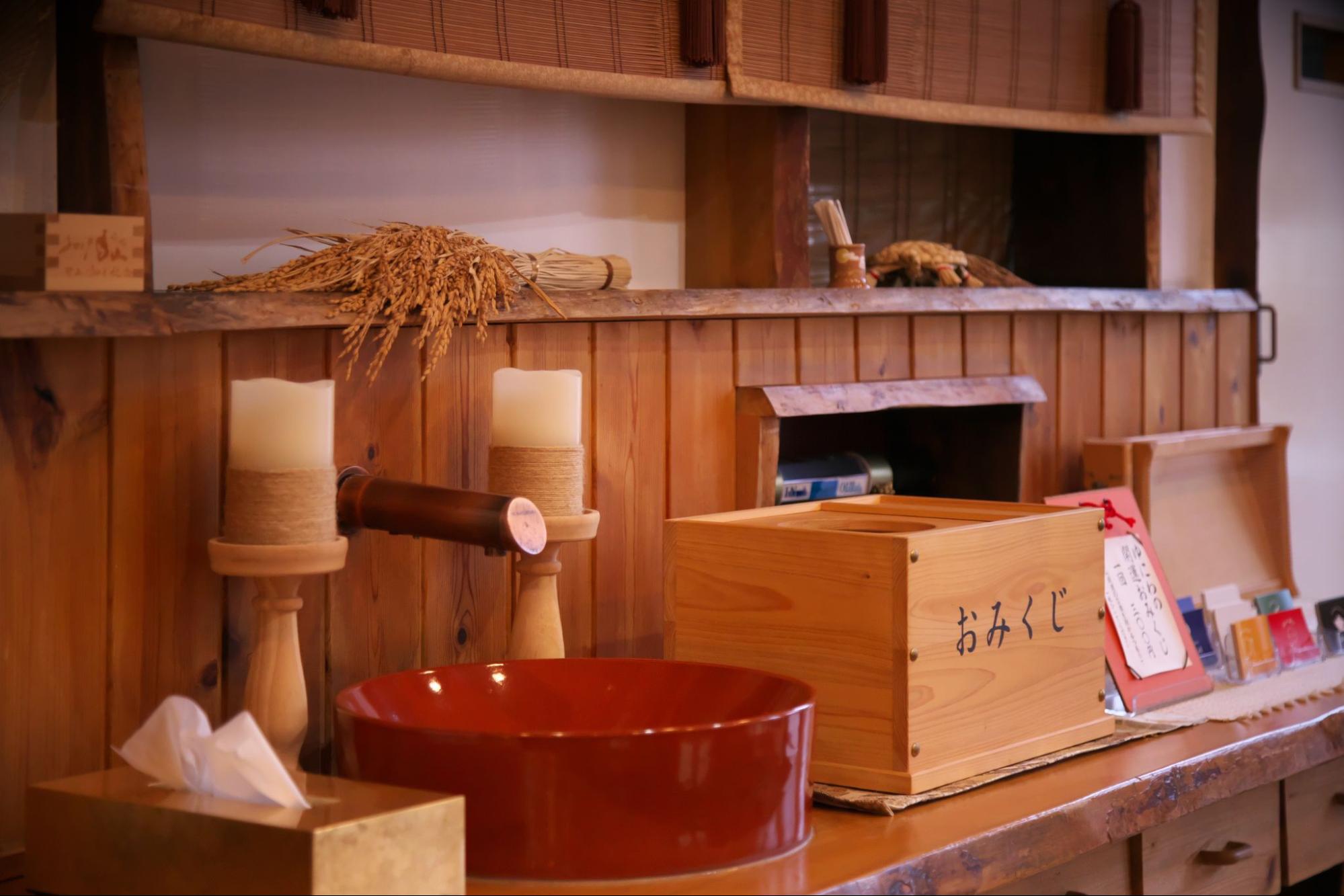 ここで手と口を清めて「禊祓(みそぎはらえ)」をするように、お店の入り口でお客様に手を清めていただいています。
