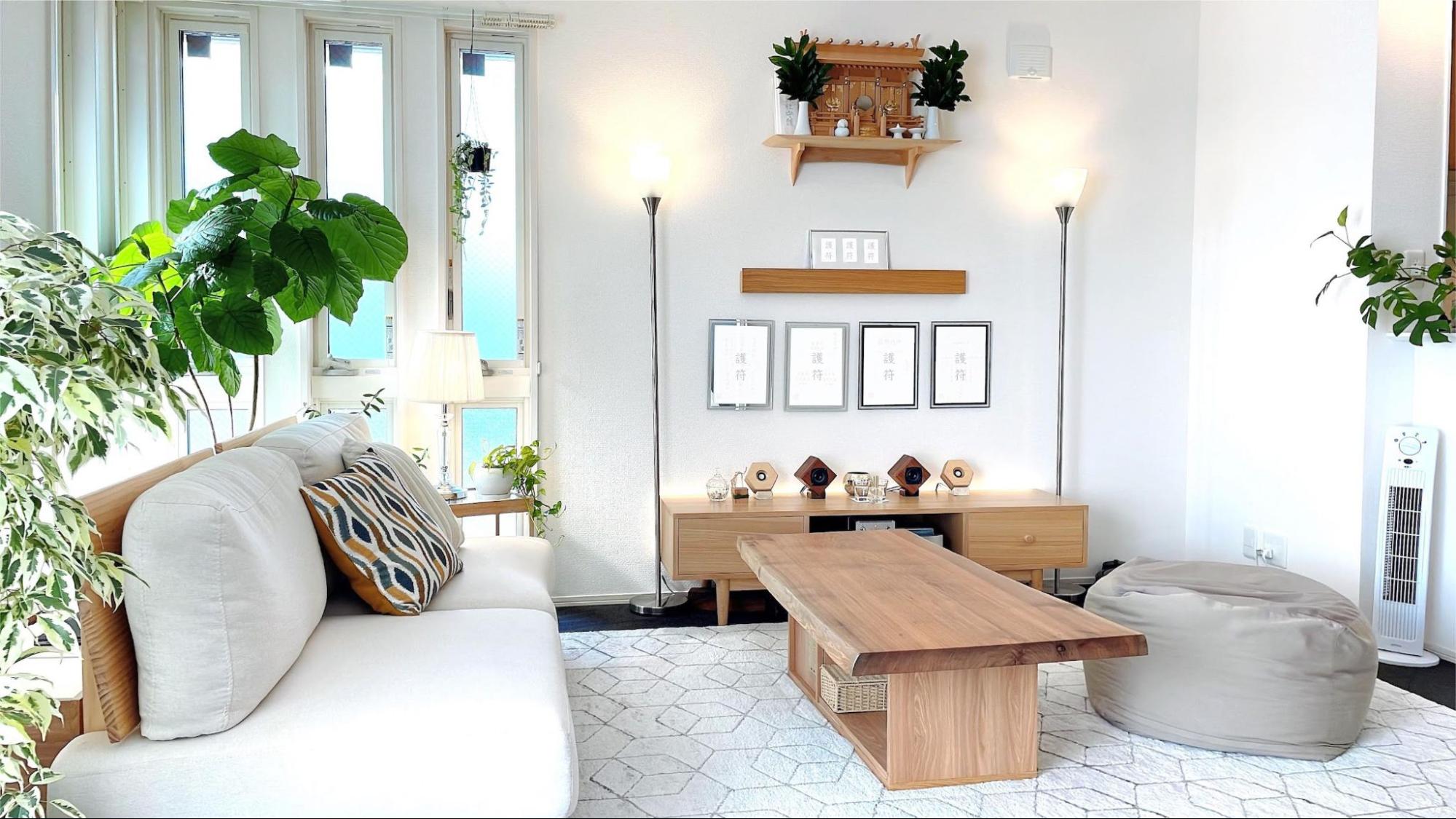 神棚のふもとにソファを置いてくつろぎのスペースにすることで、常に神様に見守られている安心感が生まれ、普段の会話や生活も穏やかになった、といいます。