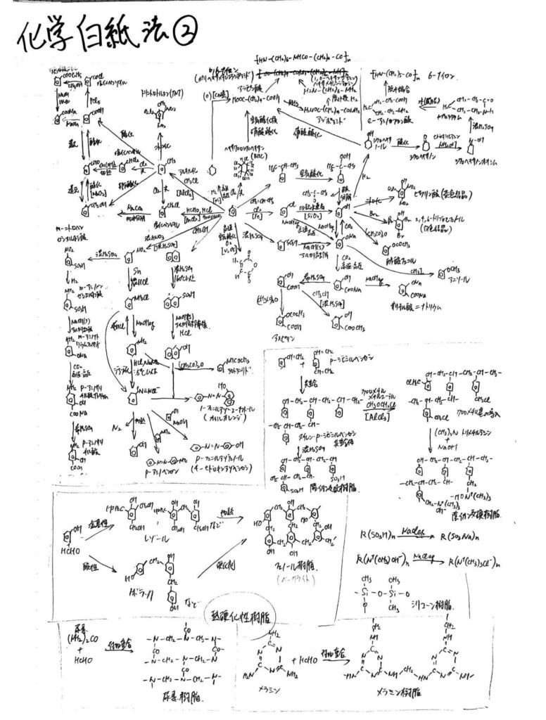 ▲化学を一元化したB4用紙(一枚の紙に重要な情報をまとめる大逆転勉強法の一つ)