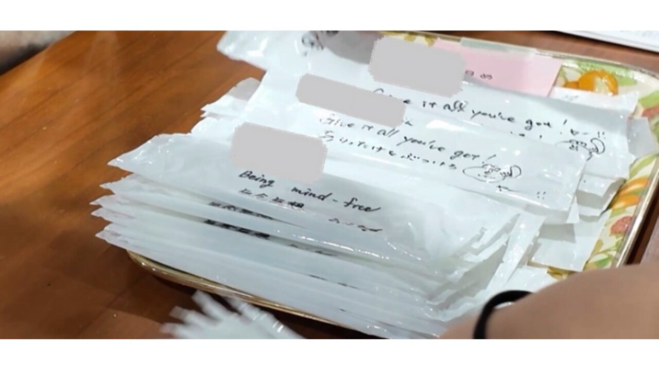 一つひとつ応援メッセージを書いたおしぼりを忍ばせます。